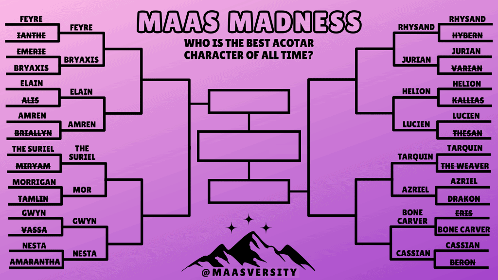 Based on the popular NCAA College Basketball tournament, Maas Madness pits character against character in a series of voting rounds where YOU, my fellow Maasochists and ACOTAR addicts, determine who advances and who falls.